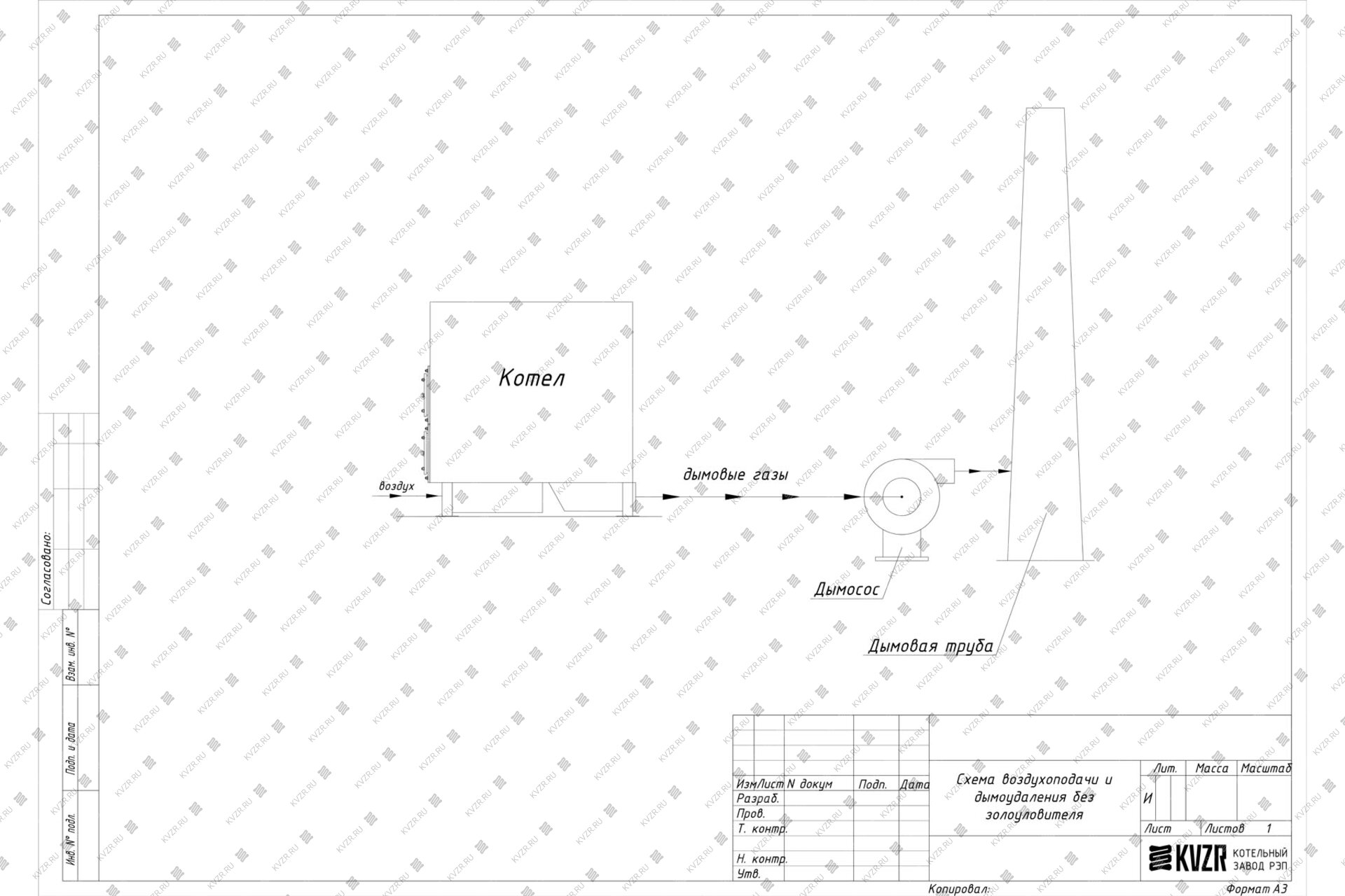 При работе котла на дровах 230 кВт на древесном топливе дополнительная очистка дымовых газов с помощью золоуловителей не нужна. Схема подключения при этом следующая - дымовые газы выходят из котла в газоходы котельной, затем в дымосос и далее снова по газоходам в дымовую трубу. В зависимости от компоновки котельной дымосос может устанавливаться как в котельной, так и на улице. Наш завод производит газоходы и переходники к ним. Получив схему вашей котельной мы можем изготовить для вас комплект газоходов, переходников нужных размеров и сечений. На месте такие детали собираются как конструктор. Обращаем ваше внимание, что газоходы требуют изоляции, для защиты персонала от ожогов, так как уходящие газы имеют высокую температуру, а на улице газоходы требуют изоляции для избежания образования конденсата.