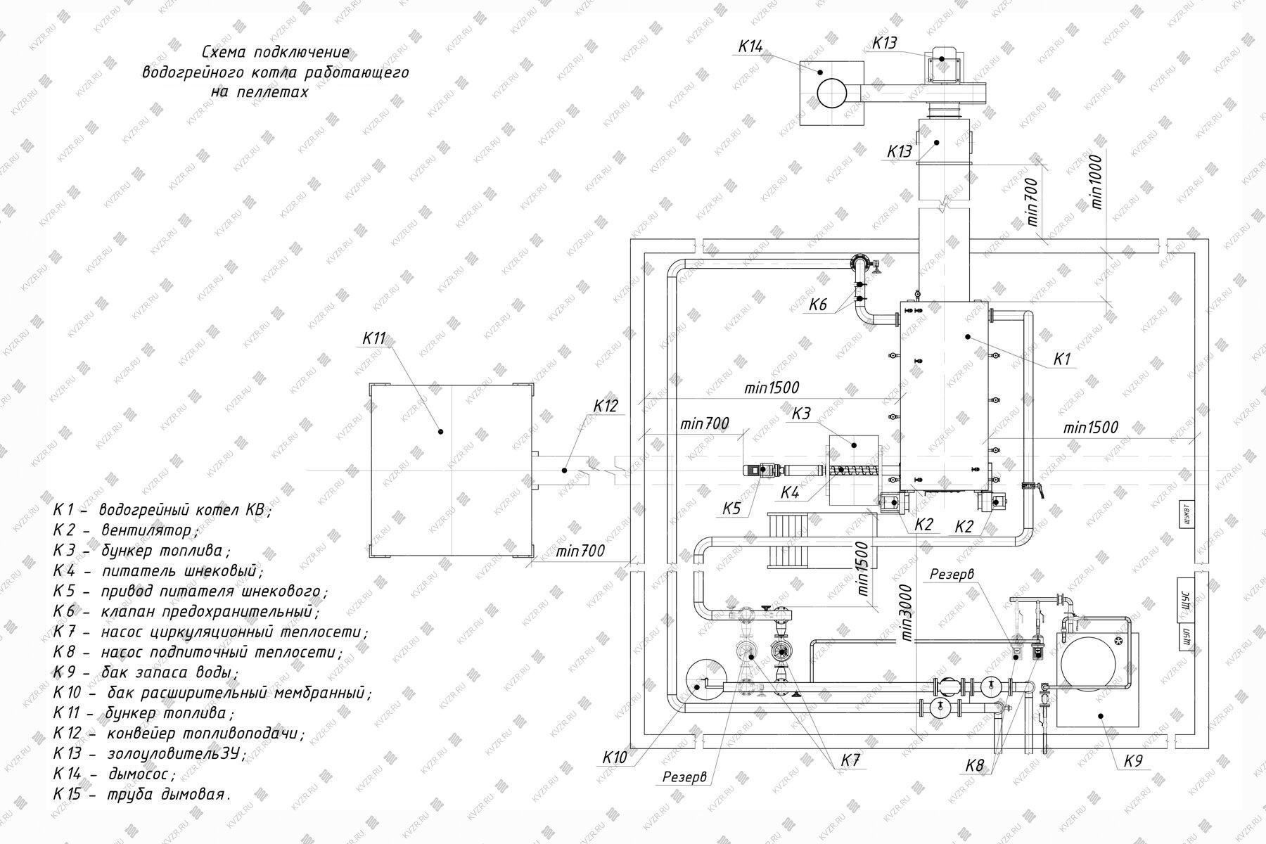 Конструкция водогрейных пеллетных котлов - водотрубная стальная с вихревой топкой или ретортной горелкой, бункером и автоматической шнековой подачей.
