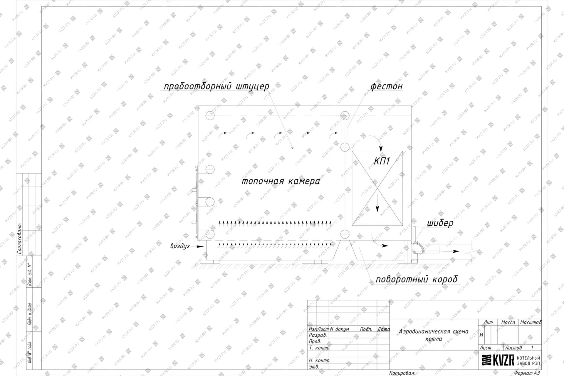 Воздух в водогрейный котла на дровах 150 кВт на дровах подается вентилятором поддува через топочный короб под слой древесного топлива для обеспечения горения. На боковой панели топки котла имеется пробоотборочный штуцер для подключения манометра и тягонапорометра.